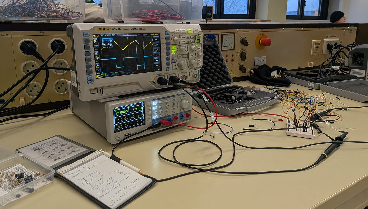 Die meisten unserer Kurse sind theoriegeleitet, aber hin und wieder haben wir die Möglichkeit, diese Theorie in Laborübungen in die Praxis umzusetzen. Das sind die Momente, in denen all das Wissen zusammengeknüpft wird. Wir haben einen PWM-Regler und einen Frequenzgenerator gebaut, und es ist unglaublich großartig zu sehen, wie theoretische Konzepte zu funktionierender Hardware werden.